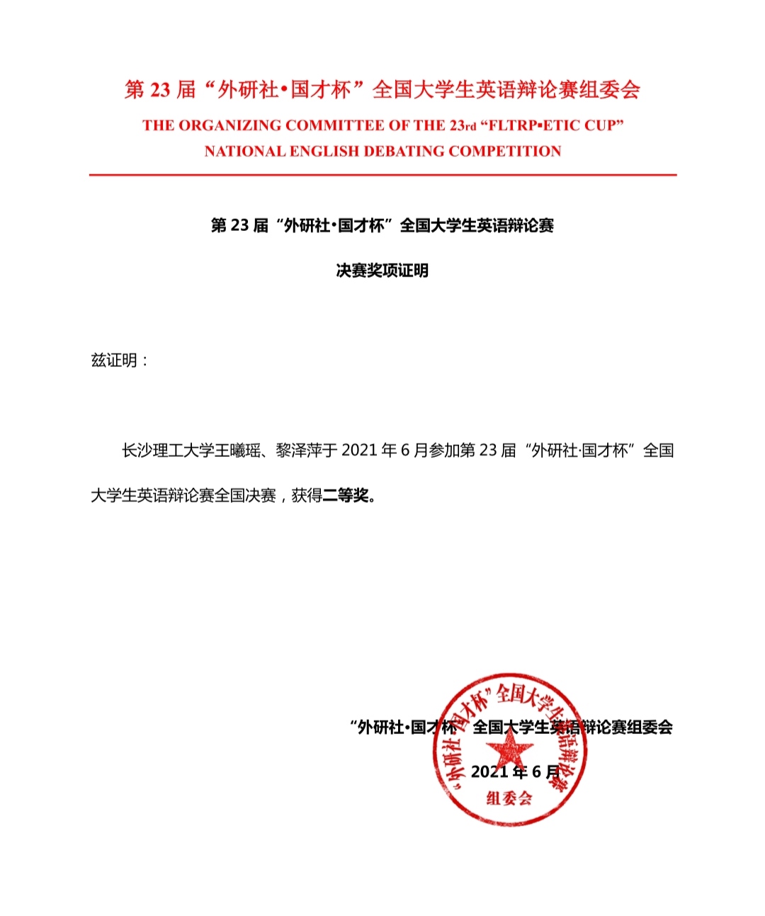 近日,第23届“外研社·国才杯”全国大学生英语辩论赛圆满结束。开云官网2018级英语专业本科生王曦瑶、2019级翻译专业本科生黎泽萍,在外国语学院王浩萍老师的悉心指导下,以过硬的专业素养、扎实的思辨能力,荣获该项赛事全国二等奖。