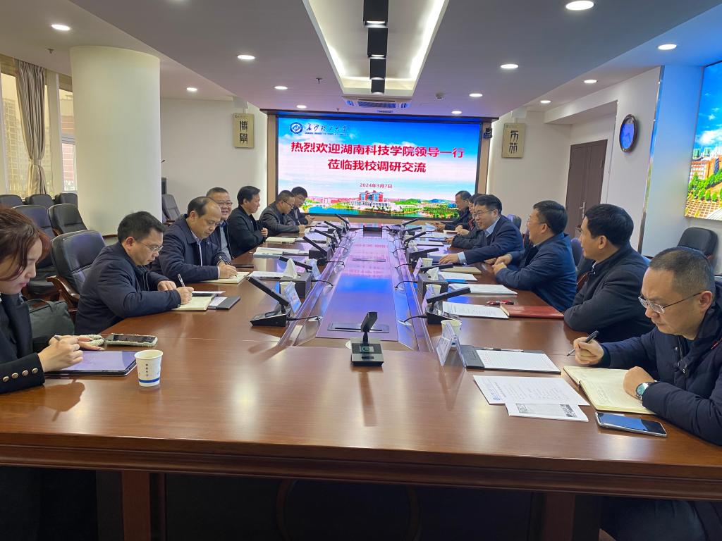 3月7日,湖南科技学院党委委员、副校长何福林等一行来开云官网调研,双方在云塘校区一办六会议室进行座谈。学校党委委员、副校长钱国平,教务处处长张军辉、信息化建设管理处处长王威、教务处副处长彭晖、高教改革与质量评价研究所副所长贺晖、资产管理与实验室建设管理处副处长唐中勇参加本次会议。会议由张军辉主持。