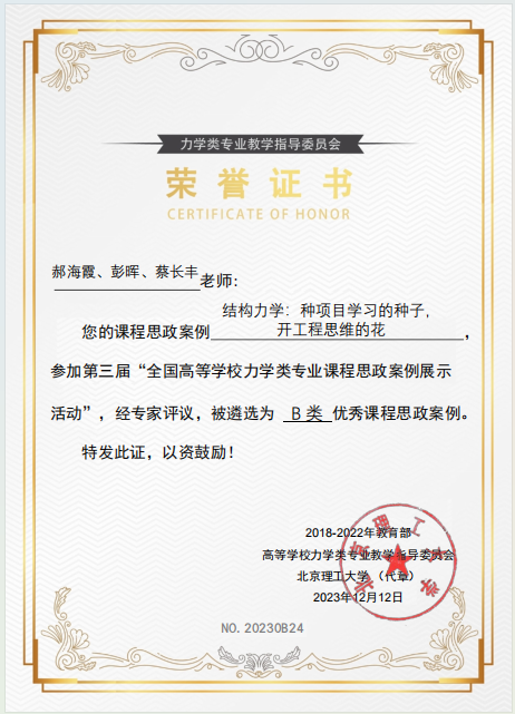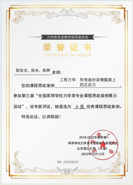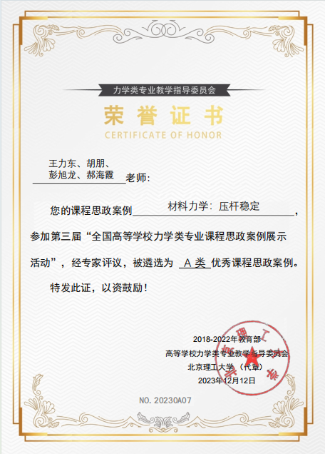 12月12日,教育部高等学校力学类专业教学指导委员会公布了第三届“全国高等学校力学类专业优秀课程思政案例展示活动”优秀课程思政案例的遴选结果。我院王力东、胡朋、彭旭龙、郝海霞老师所撰写的《材料力学:压杆稳定》,彭旭龙、陈央、陈辉老师所撰写的《工程力学:纯弯曲时梁横截面上的正应力》分别获评A类优秀课程思政案例;郝海霞、彭晖、蔡长丰老师所撰写的《结构力学:种项目学习的种子,开工程思维的花》获评B类优秀课程思政案例。