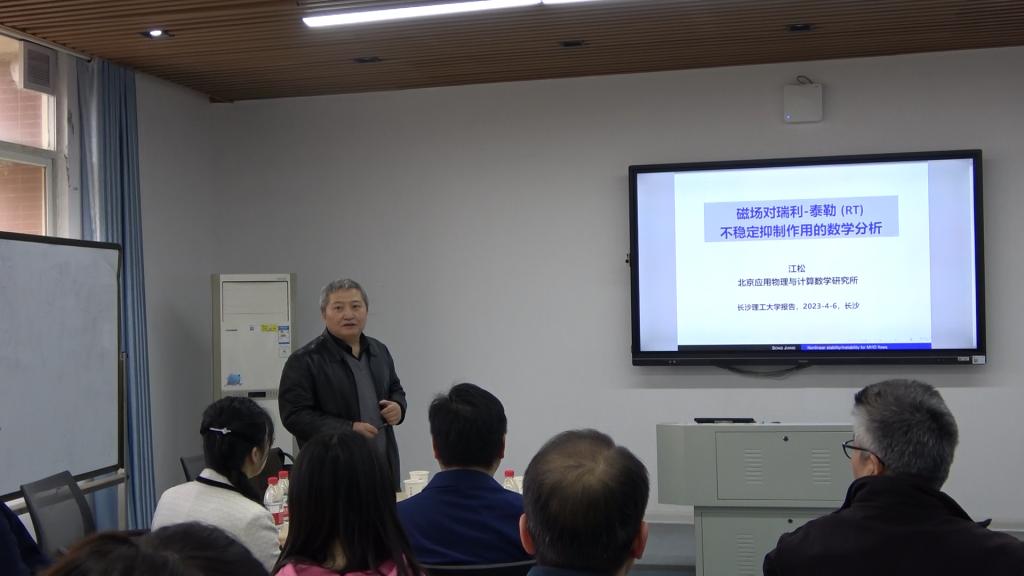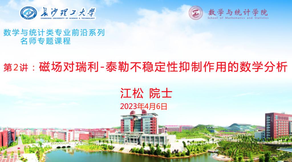 4月6日上午,数统学院开展“数学与统计类专业前沿系列名师专题课程”第二讲,特邀嘉宾是中国科学院江松院士,主题为“磁场对瑞利-泰勒不稳定性抑制作用的数学分析”。讲座由开云kaiyun体育副校长黄创霞教授主持。