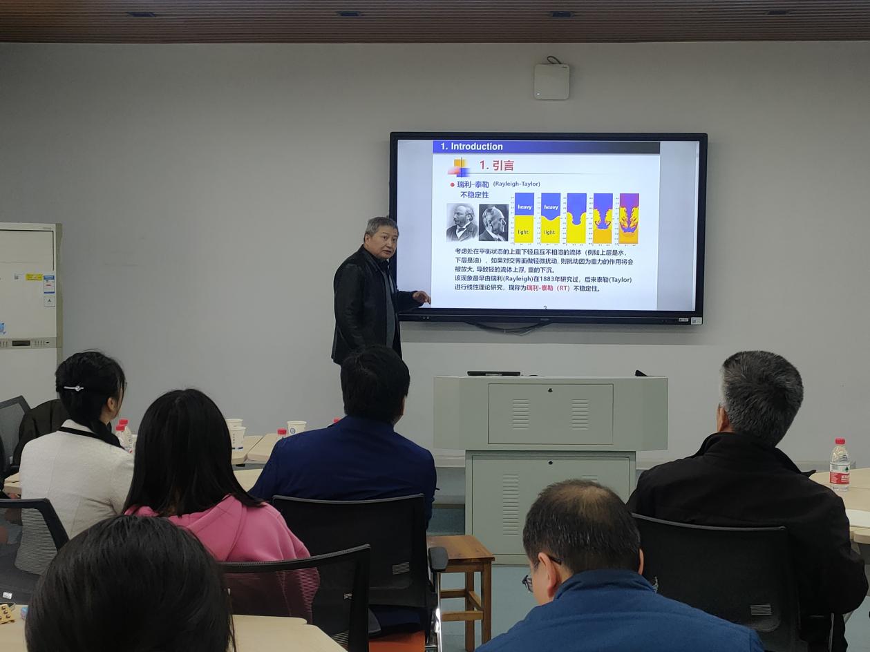 讲座中,江松院士从生活中的常见现象出发,以“下层是油、上层是水,微小扰动最终导致水下油上”为例,引出瑞利-泰勒(RT)不稳定性。接着介绍了惯性约束聚变和超新星爆炸等现象,以及影响RT不稳定性的因素,如旋转、粘度、磁场 (用于传导流体)等。江松院士重点从数学上分析了磁场对RT不稳定性的作用,考虑了可压缩MHD流体、不可压缩的分层MHD流体、可压缩的非均质MHD流体等情形。