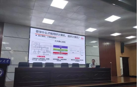 陈教授在报告中详细阐述了大规模的最新研究进展和应用前景。他首先播放了一段有关中国超级计算机发展的科普视频,并介绍了长沙超算中心的相关信息。接着介绍了计算机是如何利用计算机语言构建数字世界的。他向同学们科普了超级计算机与普通计算机在计算能力之间的差距,并通过列举一系列特效电影里每一帧利用一台家用计算机进行渲染所耗费的时间来具体说明普通计算机算力不足的问题。面对计算机科学与技术专业的同学,陈教授特地向大家讲解了本专业需要学习的内容以及这些学习内容之间的关联,让同学们更加清晰的认识到了自己所学专业的本质,有利于同学们规划学习路线,明确学习目标。