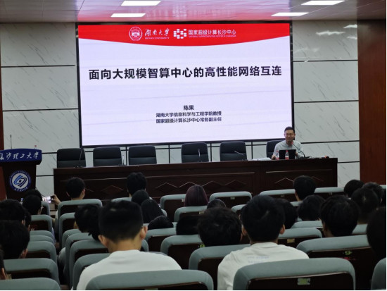 5月31日上午,开云kaiyun体育计算机与通信工程学院“计算机类专业前沿系列名师专题课程”的第八讲圆满举行。本次讲座特别邀请了湖南大学信息科学与工程学院教授、国家超算长沙中心常务副主任陈果教授。陈教授为我们作了题为“面向大规模智算中心高性能互连网络”的精彩报告。我院师生共140余人参加了此次报告会,活动由计通学院副院长夏卓群主持。
