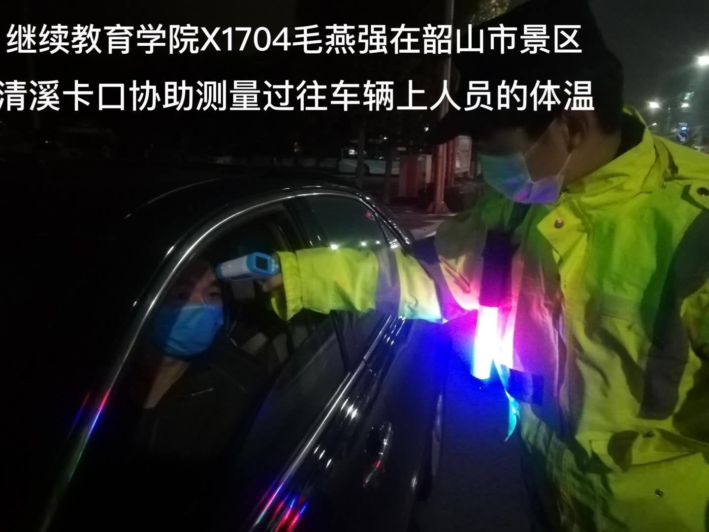 继续教育学院土木工程专业 X1704班的毛燕强同学,他从大年初一开始至今,每天在韶山市景区清溪卡口协助测量过往车辆上人员的体温。为抗击新冠肺炎疫情,贡献一己微薄之力。