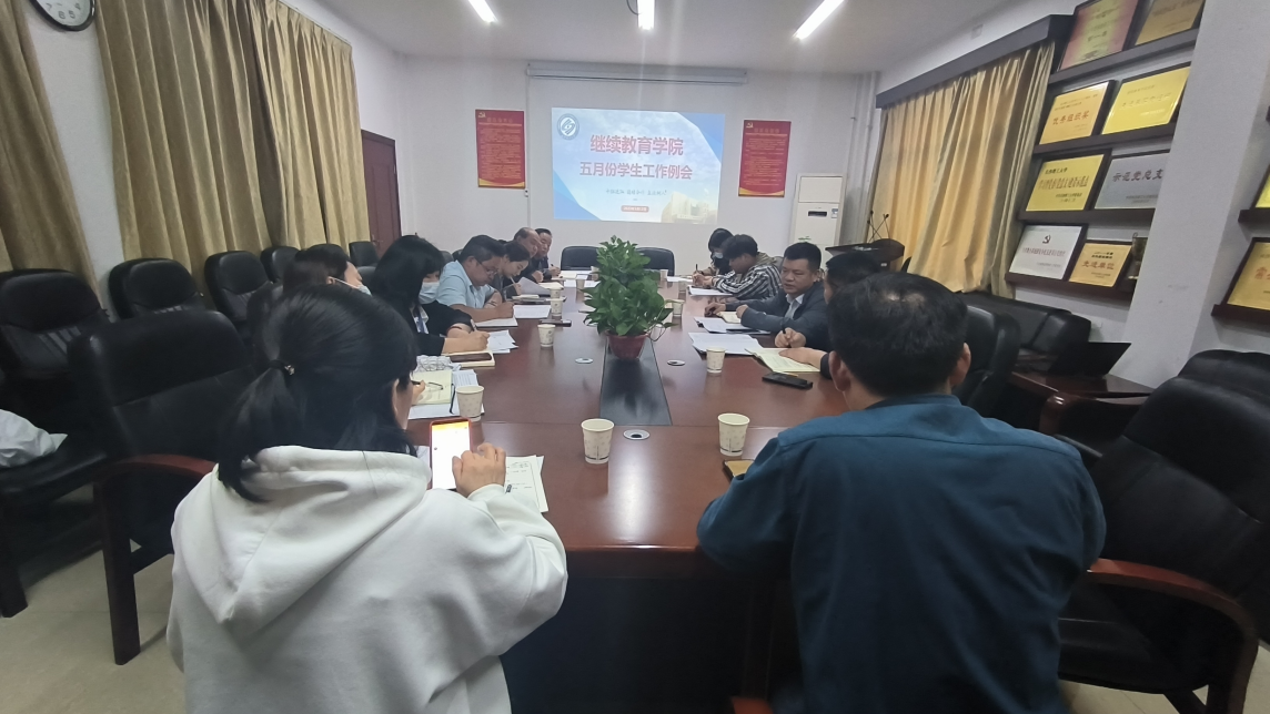 2023年5月12日上午,在15教三楼会议室,继续教育学院召开了5月份学生工作例会。学院党总支副书记谢士成,学工部主任范石泉,学工部单乃付、韩立朋、王泓博、刘煜老师,各校企合作部负责人参加会议。