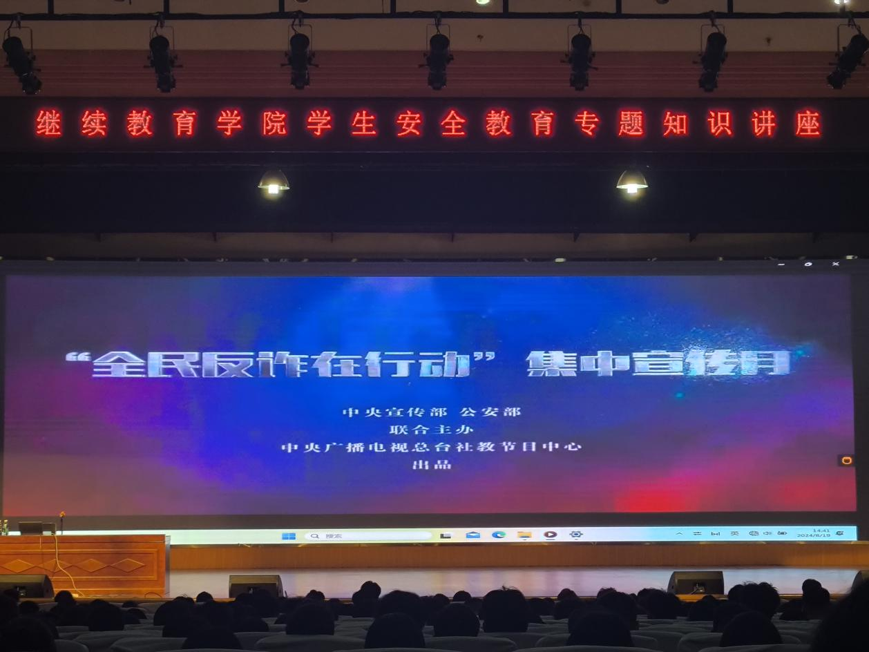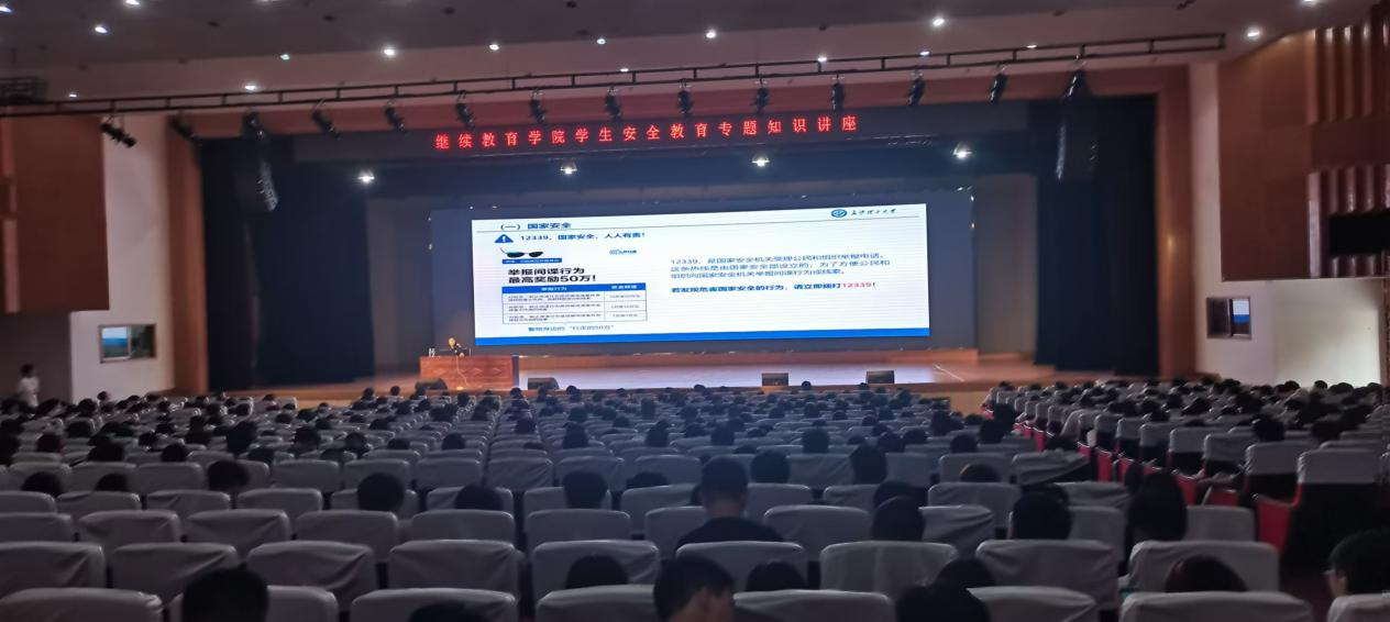 为进一步增强学生安全防范意识,提升学生自我防护能力,加强学院安全教育和管理,保障学生人身财产安全,构建平安和谐校园。8月19日下午,继教学院在金盆岭校区五教大礼堂举办了新学期学生安全教育专题知识讲座,邀请了校保卫处王艳鸿副处长主讲。学院领导、各教学部负责人及班主任和900余名学生聆听了讲座。
