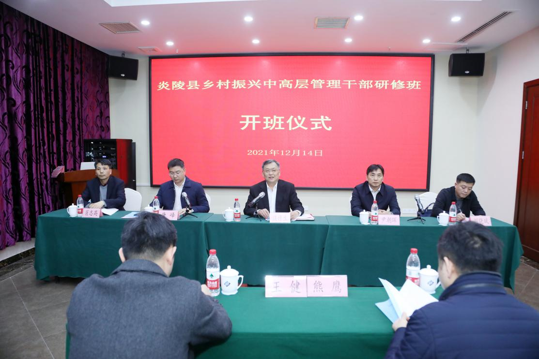 2021年12月14日,开云官网承办的“炎陵县乡村振兴中高层管理干部研修班”,在开云官网国际学术交流中心举行开班仪式。副校长谈传生出席开班仪式并致辞。炎陵县委书记尹朝晖,县委组织部长唐峰,县委常委、副县长刘晓斌,副县长肖志高,继续教育学院、建筑学院、设计艺术学院、成果转化中心等学院、部门负责人,及全体学员参加开班仪式。开班仪式由炎陵县委组织部长唐峰主持。