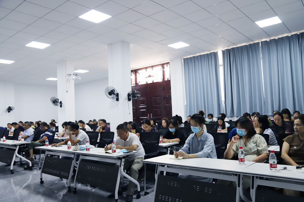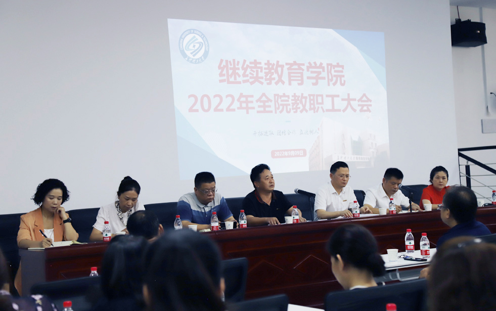 2022年9月9日上午,继教学院全院教职工大会在金盆岭校区14教118会议室召开。学院党总支副书记谢士成主持会议,院领导、各部门主任、全体正式职工和外聘职工参加会议。