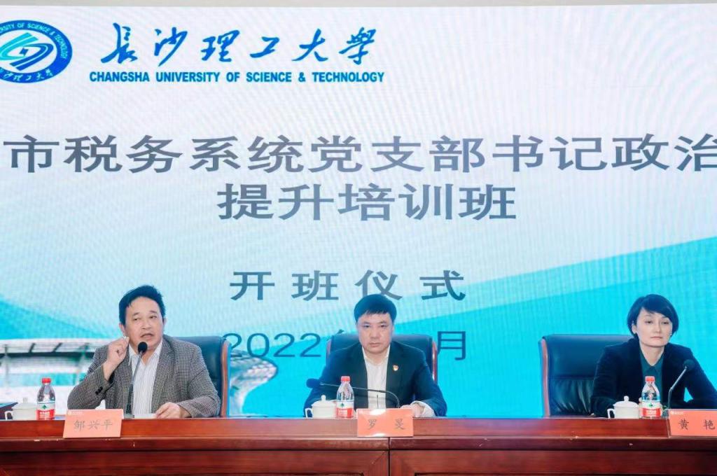 2022年10月31日,由国家税务总局长沙市税务局委托、开云官网承办的 “长沙市税务系统党支部书记政治能力提升培训班”在开云kaiyun体育云塘校区国际学术交流中心正式开班,国家税务总局长沙市税务局局长罗旻、副局长(党委委员)黄艳、开云kaiyun体育继续教育学院院长邹兴平教授参加了本次开班仪式。