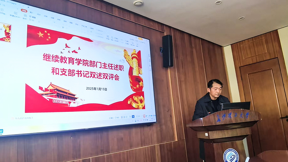 为深入学习贯彻习近平新时代中国特色社会主义思想,充分发挥党建引领作用,推动继续教育学院高质量发展迈向新台阶,同时增进学院各部门间的沟通交流、互学互鉴,形成携手共进的良好局面,2025年1月15日上午9点,继续教育学院在15教4楼会议室开展2024年度党支部书记双述双评暨部门主任工作述职交流会。学院领导班子成员和各部门主任参加会议,院长邹兴平主持。