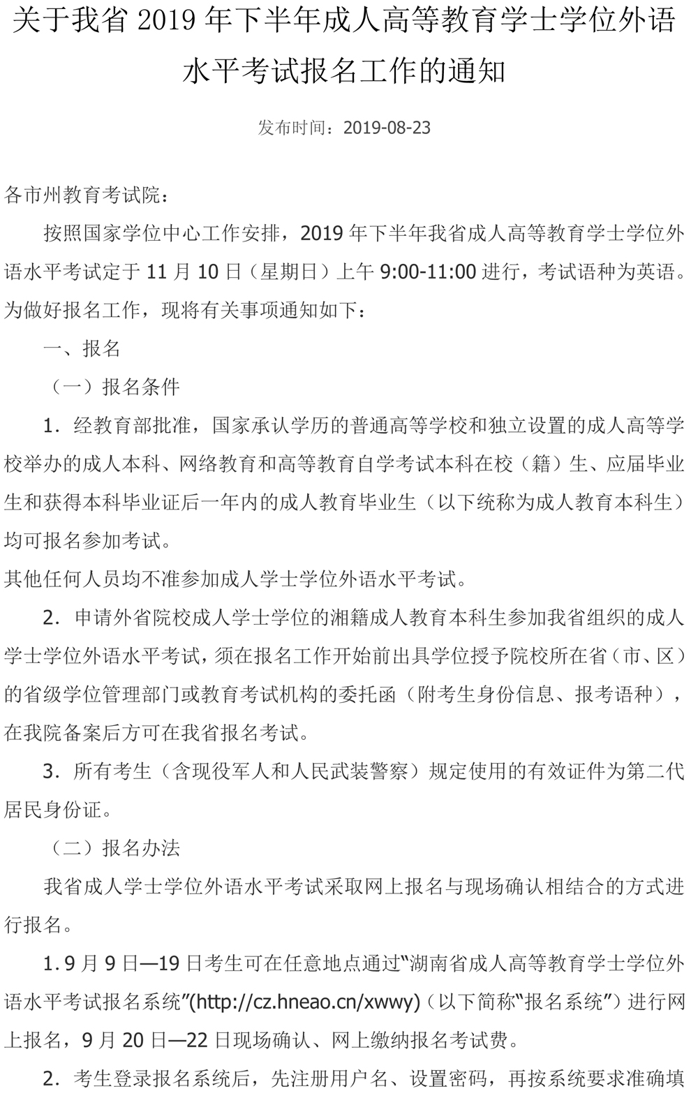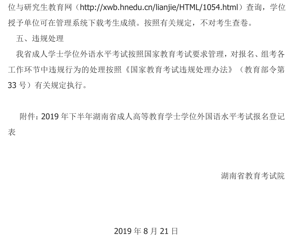 2019年下半年成人学士学位外语水平考试报名的通知
