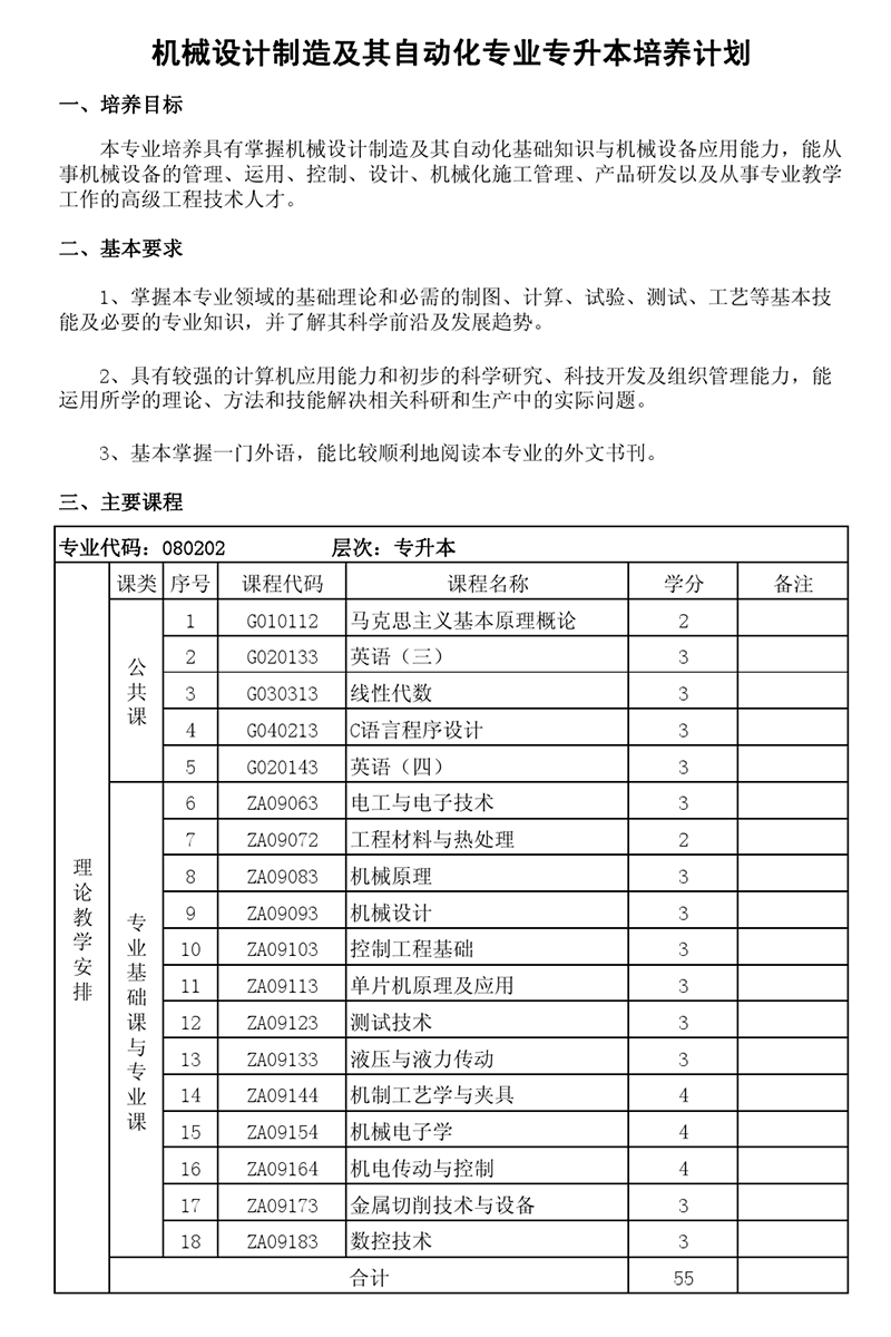 本科培养计划-专业代码:080802 机械设计制造及其自动化专业