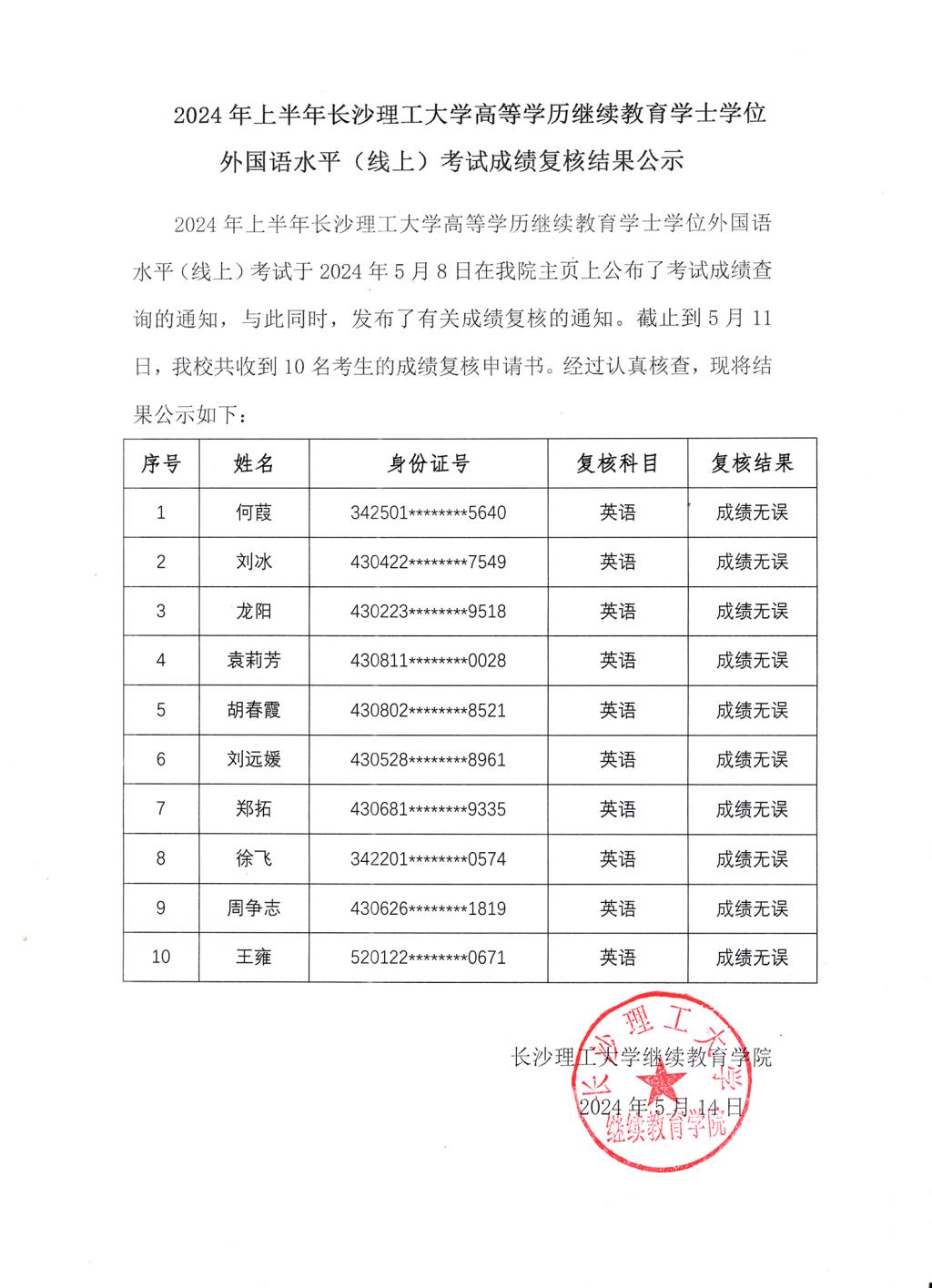 2024 年上半年开云kaiyun体育高等学历继续教育学士学位外国语水平(线上)考试成绩复核结果公示