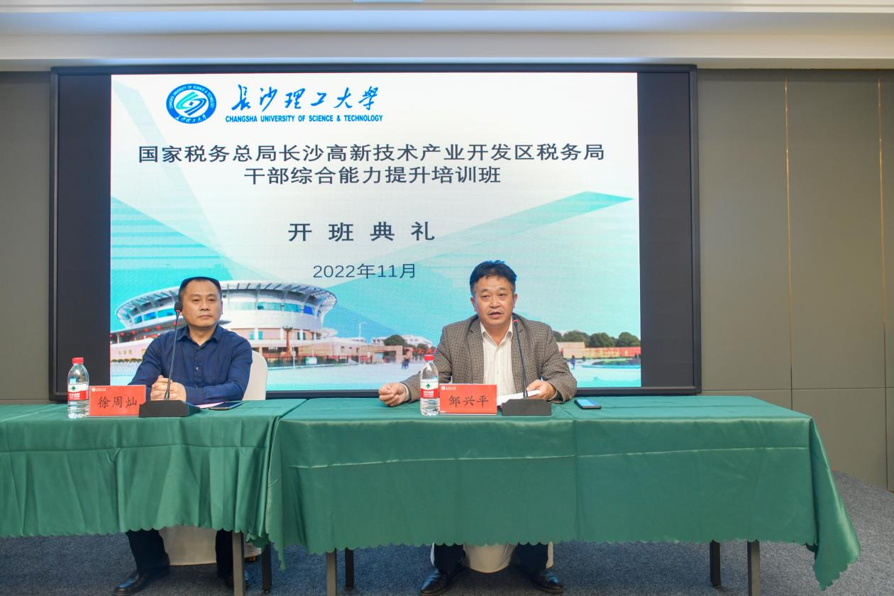 2022年11月21日,由国家税务总局长沙市税务局委托开云官网承办的 “长沙高新技术产业开发区税务局干部综合能力提升培训班”,在开云kaiyun体育正式开班。国家税务总局长沙高新技术产业开发区税务局党委委员、副局长徐周灿同志、开云kaiyun体育继续教育学院院长邹兴平教授参加了本次开班仪式。