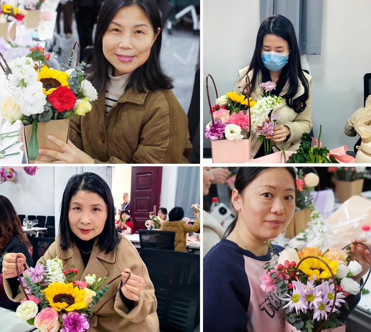 在活动现场,精心挑选和布置的花卉、精美海报、色彩丰富的气球装饰以及琳琅满目的茶点摆放,处处体现出学院党政领导对女教职工的关怀尊重和学院工会的周到考虑。专业的花艺师担任现场活动指导,演示了插花的基本技巧、花材的选择搭配,并深入讲解了如何设计插花作品的整体布局。女教职工们也在活动中学习了插花的知识,并在花艺师的精心指导下亲手体验了插花的乐趣,各自创造出富有个人特色的插花艺术作品。会场里,人与花相映成趣,分外美丽,大家纷纷与自己的作品拍照合影,留住这一美好难忘时刻,场面十分温馨。