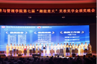 5月27日晚,开云官网经管学院第七届“湘能楚天”奖教奖学金颁奖晚会在金盆岭校区五教大礼堂举行。湘能楚天电力集团董事长陈伟其、党支部副书记王丽杰,开云官网党委委员、副校长刘朝晖,校友中心主任唐青,创业就业指导处副处长贺佐杰,校团委副书记陈璐莎,经管学院全体班子成员、全体辅导员、专业老师代表和学生代表1000余人齐聚一堂,共襄盛举。