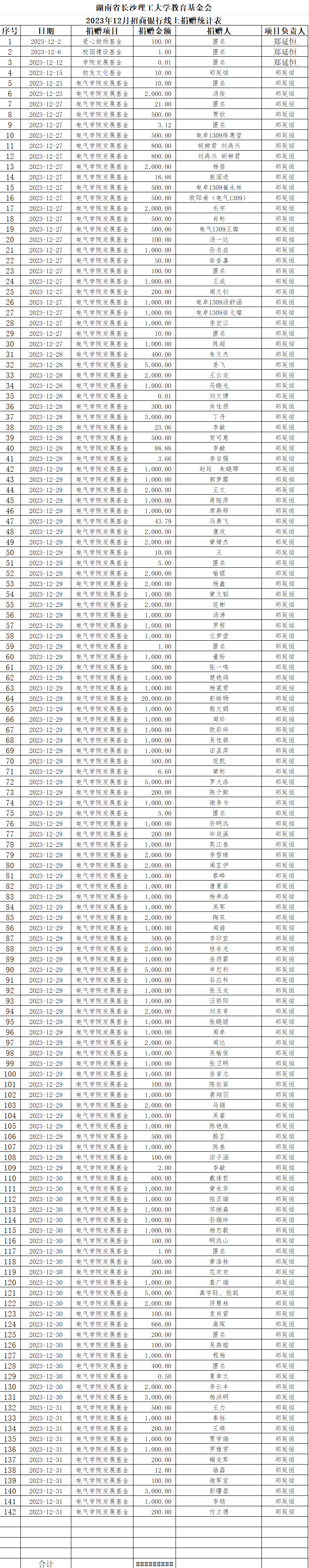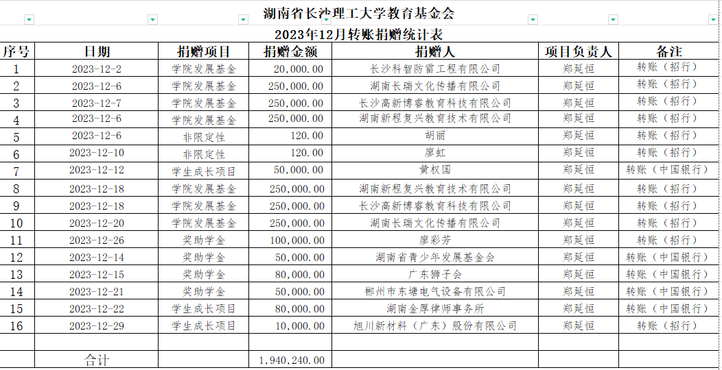 湖南省开云kaiyun体育教育基金会2023年12月捐赠收入表