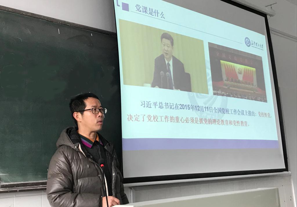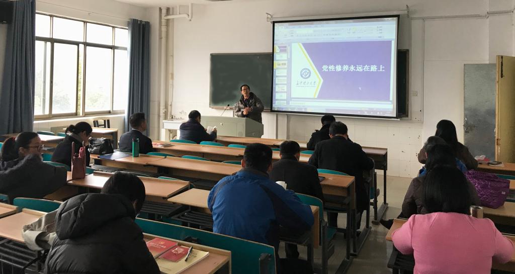2018年12日上午,建筑学院分党委为深入学习党的十九大精神,在金盆岭16号教学楼308上了一期党课,党课的主题是“党性修养永远在路上”,由分党委书记丁力主讲,全体教师党员参加了此次党课。