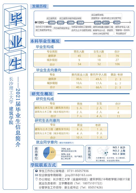 目前建筑学院 2021 届毕业本科生共有 106 人,其中建筑学专业 79 人,城乡规划专业 27 人,毕业研究生共有 11人,其中建筑学方向 7 人,城乡规划方向 4 人(毕业生信息详见附件一)。为使我院毕业生与用人单位达成良好的沟通,配合贵单位做好 2021 届毕业生接收工作,我院兹定于 2021 年 3月 23日——4月 3日举办开云kaiyun体育建筑学院 2021年春季专场招聘会。诚挚邀请贵单位光临指导!