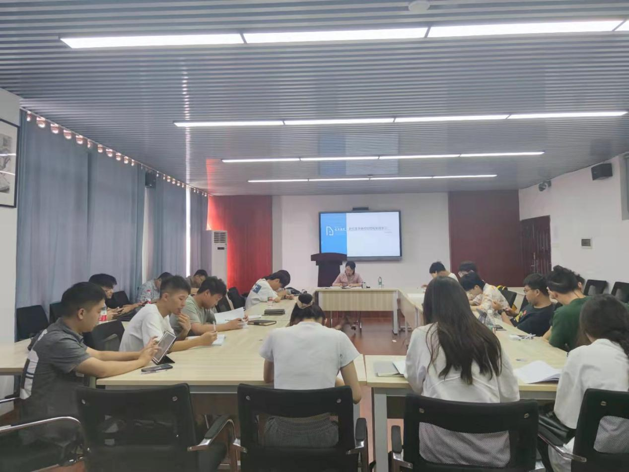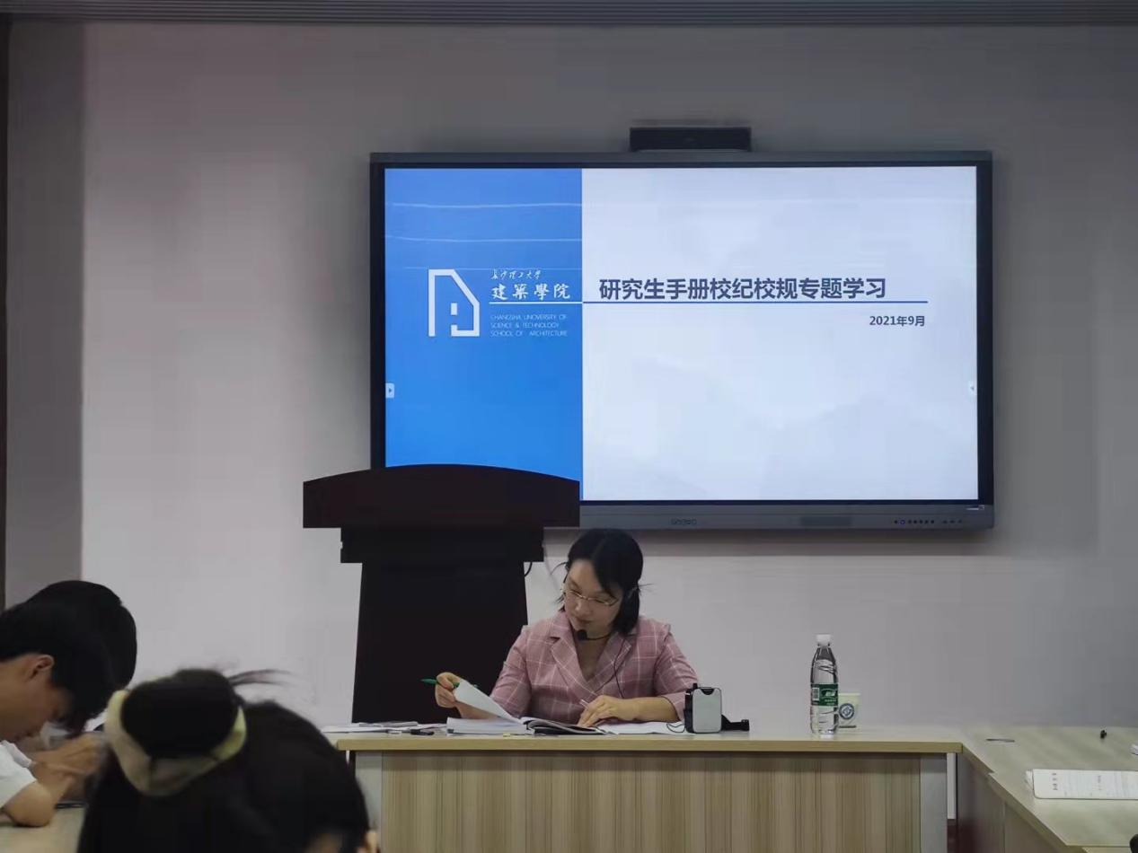 2021年9月9日上午10:00,建筑学院《研究生手册》校纪校规专题学习会议在金盆岭校区16教多媒体会议室召开,会议由学工办周芳老师主讲,2021级全体研究生新生参会。