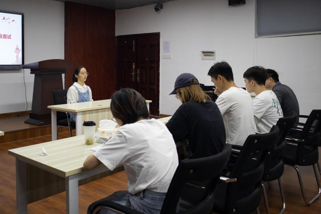 第一部分为无领导小组讨论面试,整个面试分为三个批次进行,面试给到候选人两个题目,供大家畅所欲言,合作共谈,发表自己的见解,展现自己的态度。在展示后,主席团和团委副书记会进行评价和鼓励,整体氛围活跃积极,展现了候选人良好的精神面貌。第二部分为单人面试,每个候选人都自信满满,介绍了自己的工作和特点,表达了对部门未来的美好的展望以及自己想推行的做法,展现了自己的思维方式和领导能力。随后,王老师、主席团和团委副书记根据他们的表达,对候选人进行提问,从对自己的工作想法到以后怎么展开工作,整个答问环节氛围良好。