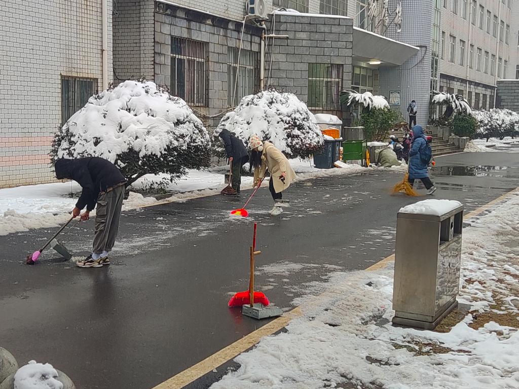 当天下午志愿者们自备劳动清理工具,分组来到不同的指定地点清除道路积雪。同学们顶着凛冽的寒风纷纷拿起铁锹扫帚等工具积极主动、相互配合,迅速投入到清理积雪的行列当中,有序地清理道路积雪。他们忙碌的身影构成一道靓丽的风景线这样热火朝天的扫雪景象为寒冷的冬季增添了另一种美丽经过大家的共同努力学校的几条交通主干道恢复了往日的畅通和洁净雪日里的校园也更加温馨美丽