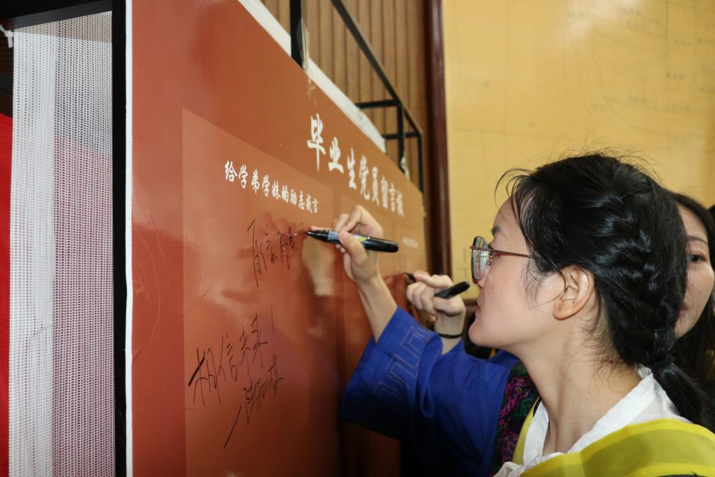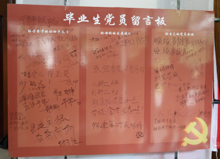 党员同志均感叹岁月时光如白驹过隙,“去年同窗聚,浩瀚书海行;今朝天涯离散,落红成两半”。他们在留言板上写下,“唯有虚心,方得圣贤”,“坚定目标,奋勇向前”,鼓励学弟学妹们努力拼搏,珍惜大学时光,做好未来规划,时间就像沙漏里的沙子,不停的流逝,时光匆匆,总要留下些足迹,祝愿学弟学妹们登高望远,携梦远行,不负青春韶华。