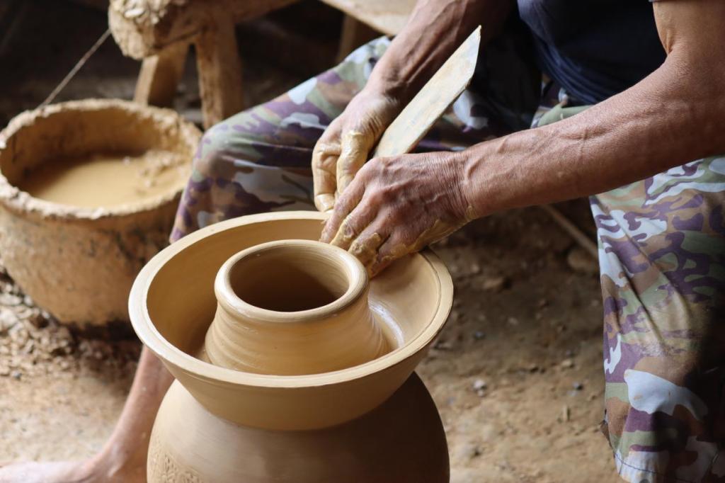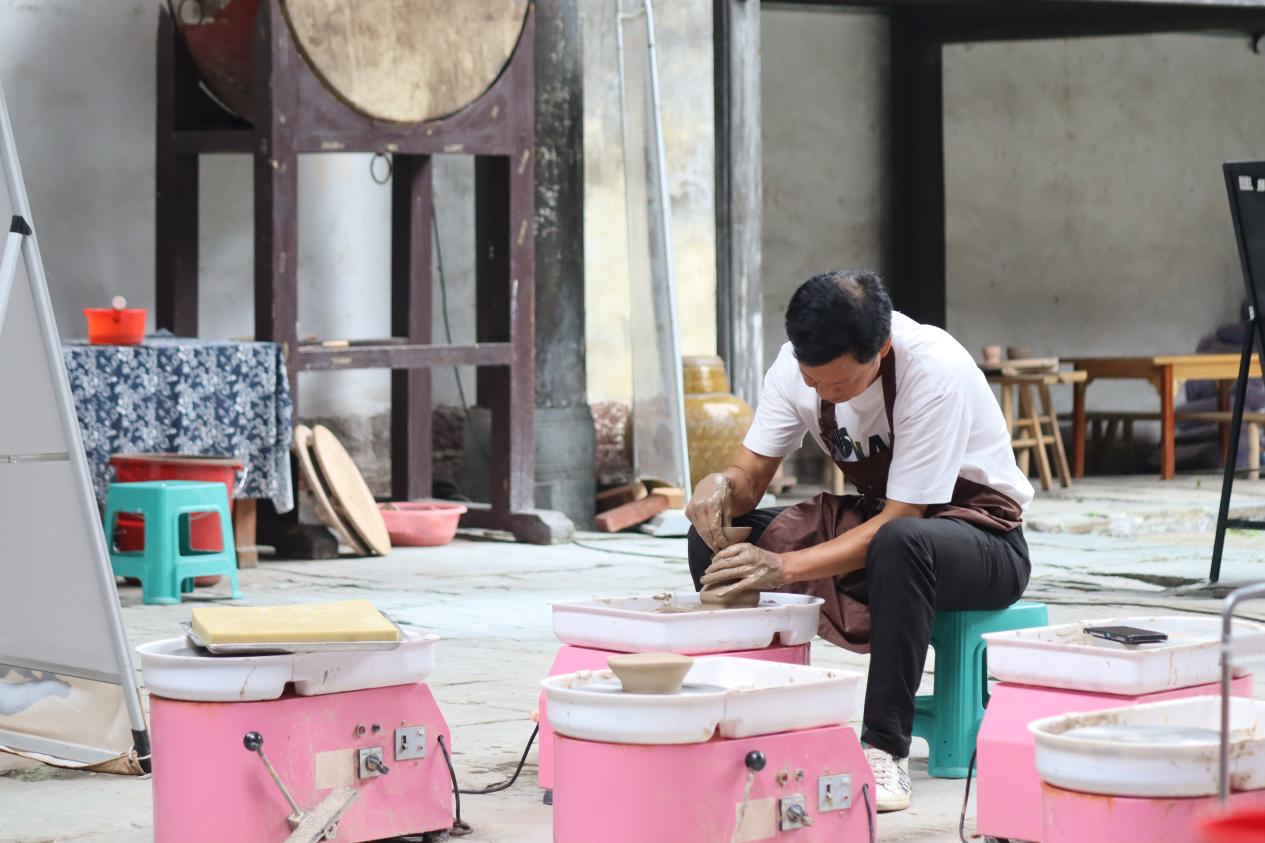 上午,实践团一行在十里窑侗黑陶第二十八代传人邱邦发的引领下,走进黔阳古城的十里窑黑陶教学实践基地。在邱师傅的生动讲解和示范下,团队成员们近距离感受了黑陶烧制技艺的精湛工艺和深厚底蕴。每一件陶器背后,都承载着一段段动人的故事,让人不禁对这门古老技艺肃然起敬。在邱师傅的指导下,团队成员们亲手体验了陶胚的制作过程,并在作品上留下了自己的指纹印记。
