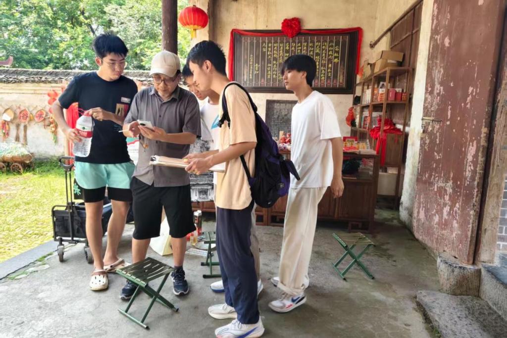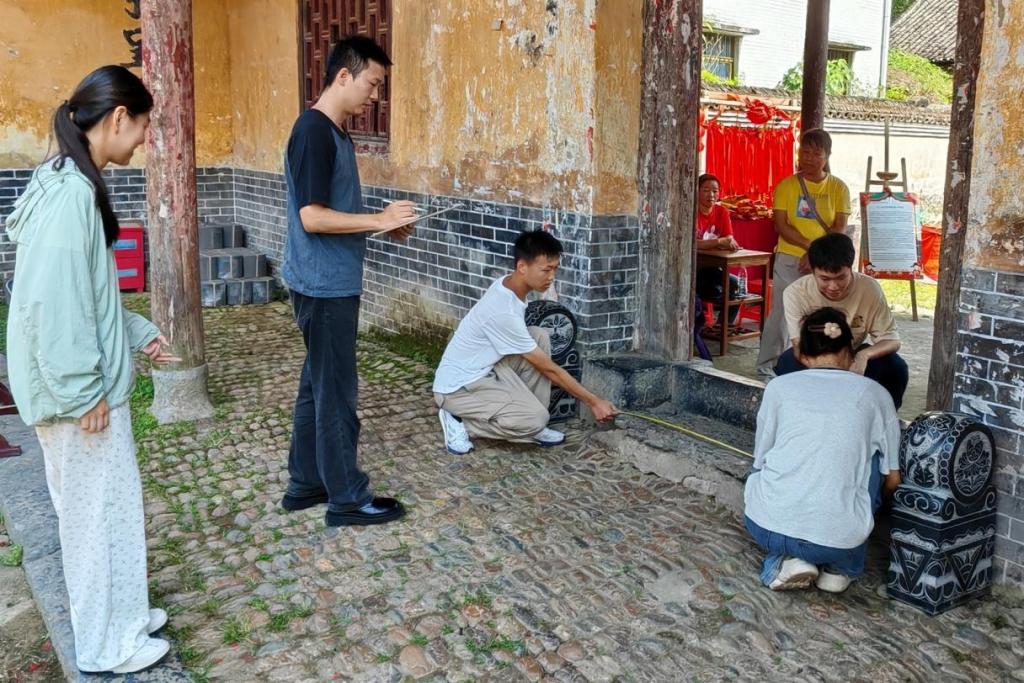 在踏上秀水村的青石板路之前,实践团已进行了详实的案头研究。成员们系统梳理了秀水状元村与状元楼自唐开元年间建村以来的辉煌历史、深厚的科举文化底蕴以及独特的瑶族风情,并探寻保存完好的状元楼现面临的保护挑战。这份扎实的前期准备,为后续的实地工作明确了目标与方向。抵达秀水村后,实践团迅速投入紧张的实地工作。成员们充分发挥专业基本功和团队协作精神,根据任务需求分为多个小组,依靠激光测距仪、卷尺、绘图板、铅笔等工具,展开了一场“匠心丈量”。实践团成员们通过村中长者、居民、村干部的交谈以及查阅族谱等方式,细致记录古村落的生活场景、空间使用习惯、历史典故、以及村民对状元楼保护与发展的真实想法与诉求。在实践团指导老师杨斯嘉老师的带领下,各组之间紧密协作,高效沟通,确保了调研成果拥有扎实的精度和深刻的内涵。通过为期十余天扎实的“文献研究+实地丈量+手绘记录+深度访谈”,实践团克服技术设备限制,获取了关于秀水村状元楼的测绘数据与手绘图纸,并同步收集整理了丰富的历史人文资料。