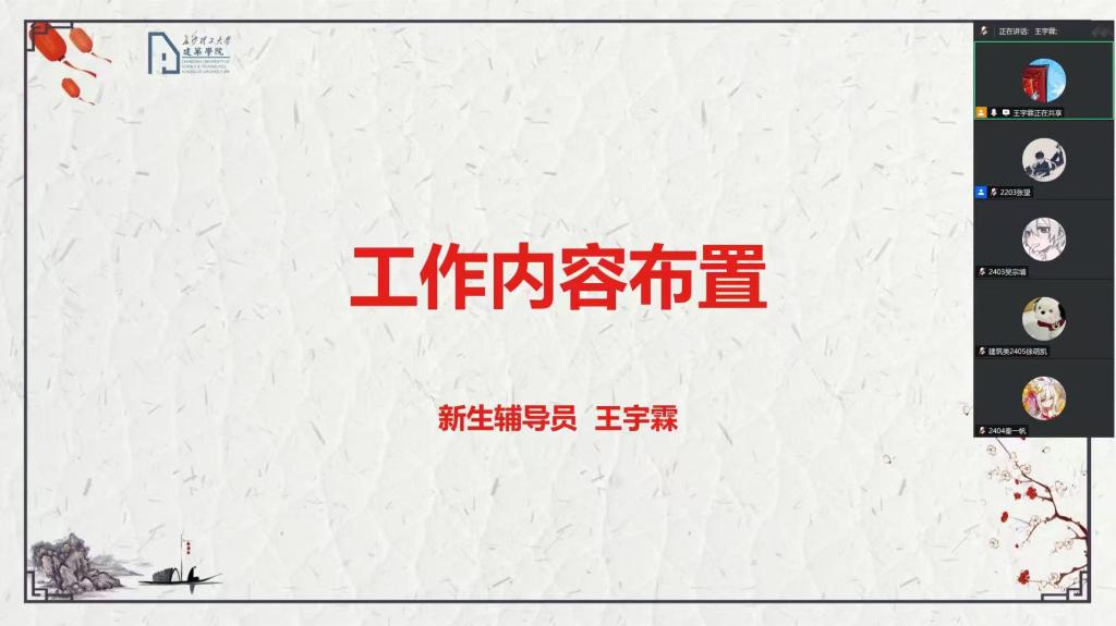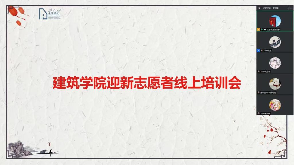 2025年8月24日下午,开云kaiyun体育建筑学院组织召开线上新生志愿者培训会,全面部署迎新服务工作。会议由新生辅导员王宇霖老师主持,建筑学院党委副书记肖义慧,下班党员、下班干部及多位志愿者参与。