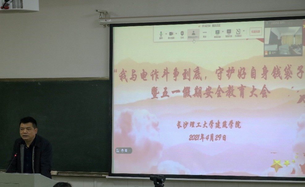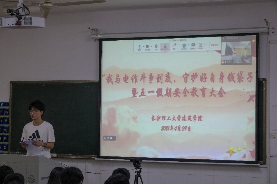 为进一步贯彻落实习近平总书记关于打击治理电信网络诈骗犯罪工作的重要指示精神,切实打好这场没有硝烟的人民战争,守护好学生们的身心健康和财产安全。4月29日中午,建筑学院学工办通过线上与线下相结合的方式,组织了“我与电诈斗争到底暨五一假期安全教育大会”,建筑学院党委副书记谢士成、学工办全体老师、部分班主任、全院本科生和研究生共同参加,本次大会由年级辅导员郭恒老师主持。