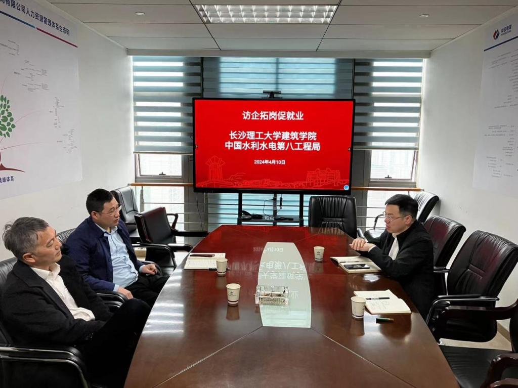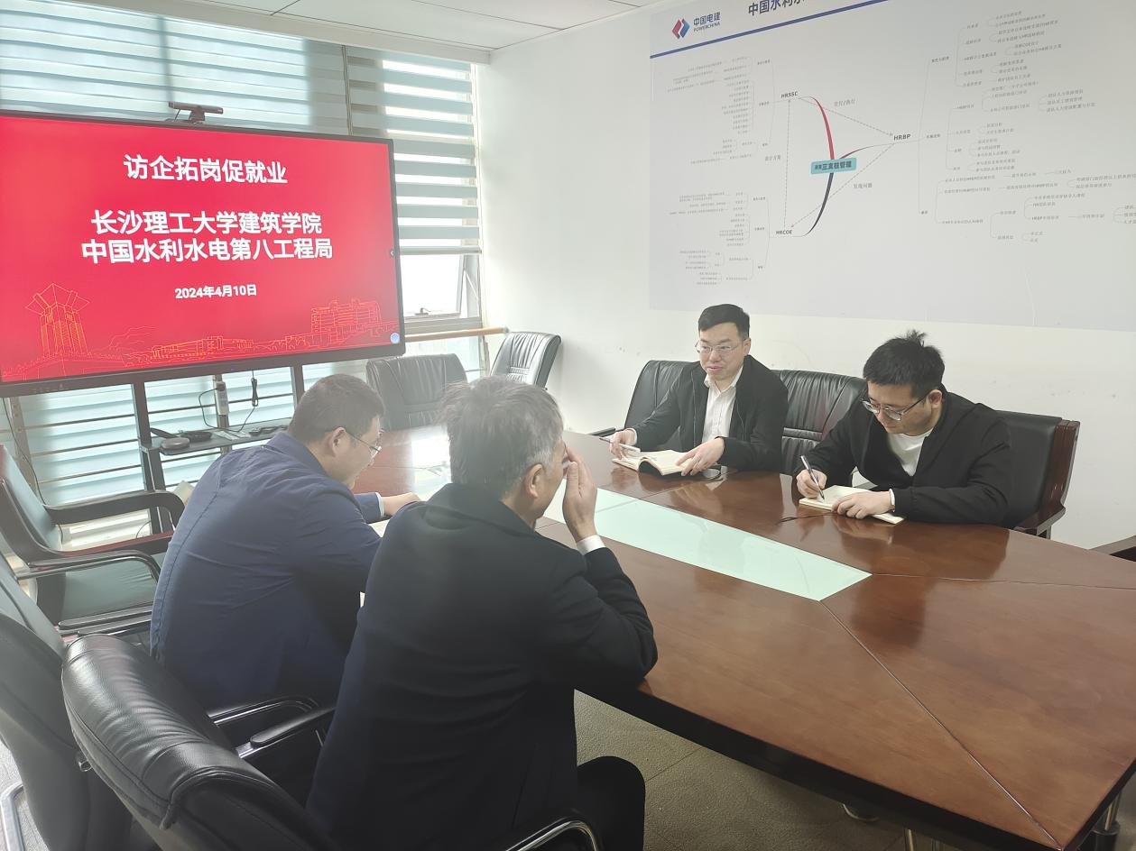 为深入推进“访企拓岗促就业”专项行动,全面深化产教融合,拓宽学生就业渠道、提高就业质量。4月10日,建筑学院党委副书记李家春、就业专干王宇霖一行两人赴中国水利水电第八工程局有限公司开展“访企拓岗促就业”专项行动,并进行座谈交流。中国水利水电第八工程局有限公司人力资源部副主任瞿明星,人力资源部三级经济专家邓世华出席本次座谈交流会议。