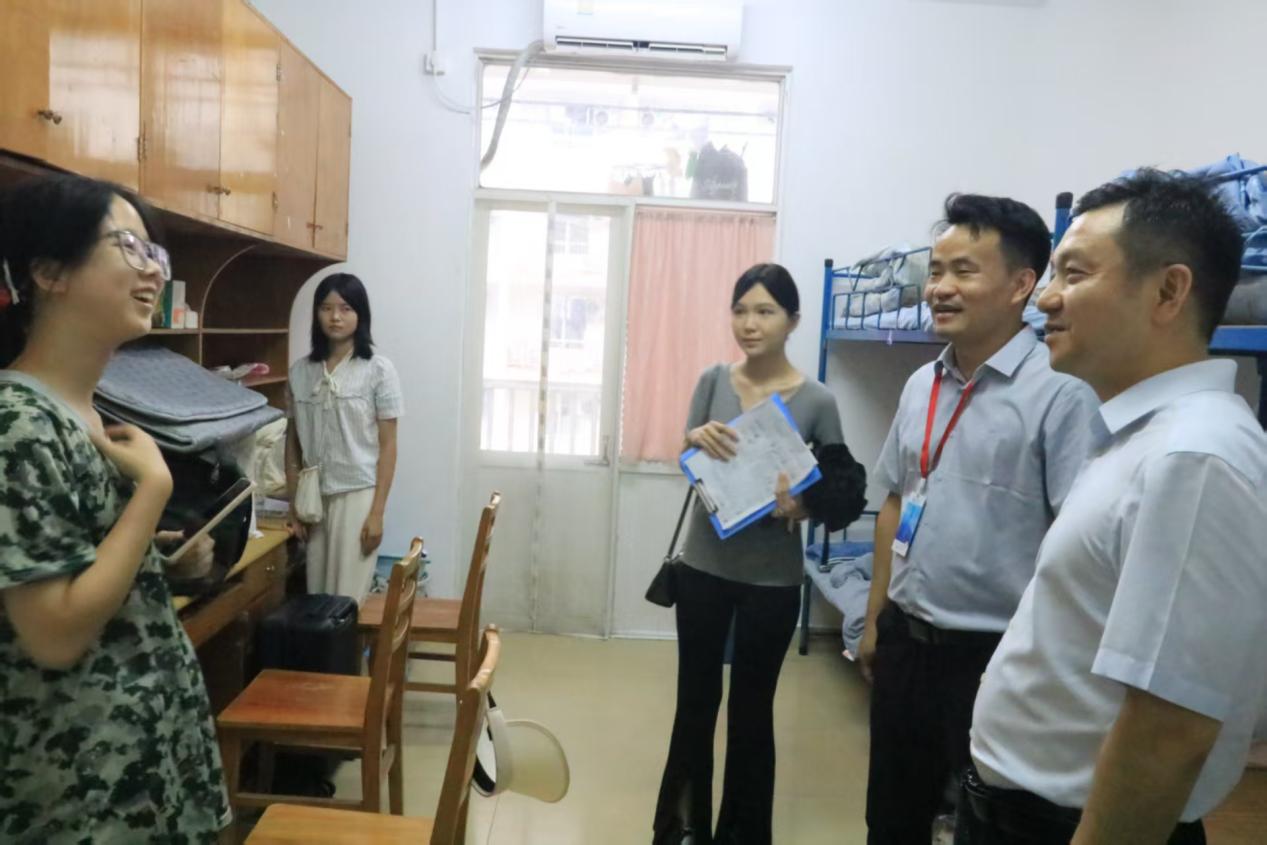 走访过程中,学院领导仔细察看宿舍的床铺、桌椅、水电等基础设施配置,详细询问新生们的来校路程、住宿感受及生活需求,耐心解答关于专业学习、校园生活服务等方面的疑问。针对新生提出的宿舍物品添置、作息安排等问题,随行辅导员老师与工作人员现场记录并承诺尽快协调解决。