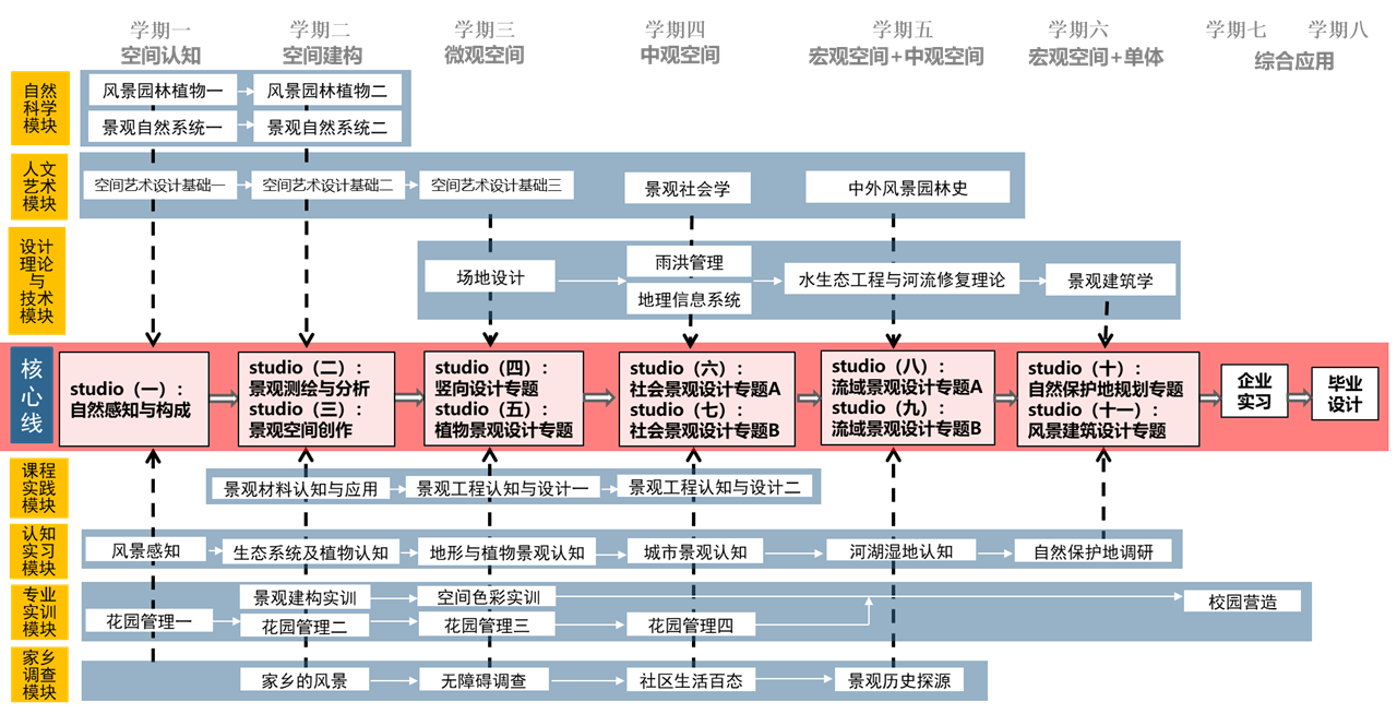本专业课程体系以规划设计为核心,“基础理论”、“空间规划与设计”、“实践”三线并行,形成纵向贯通,横向融合的知识网络。