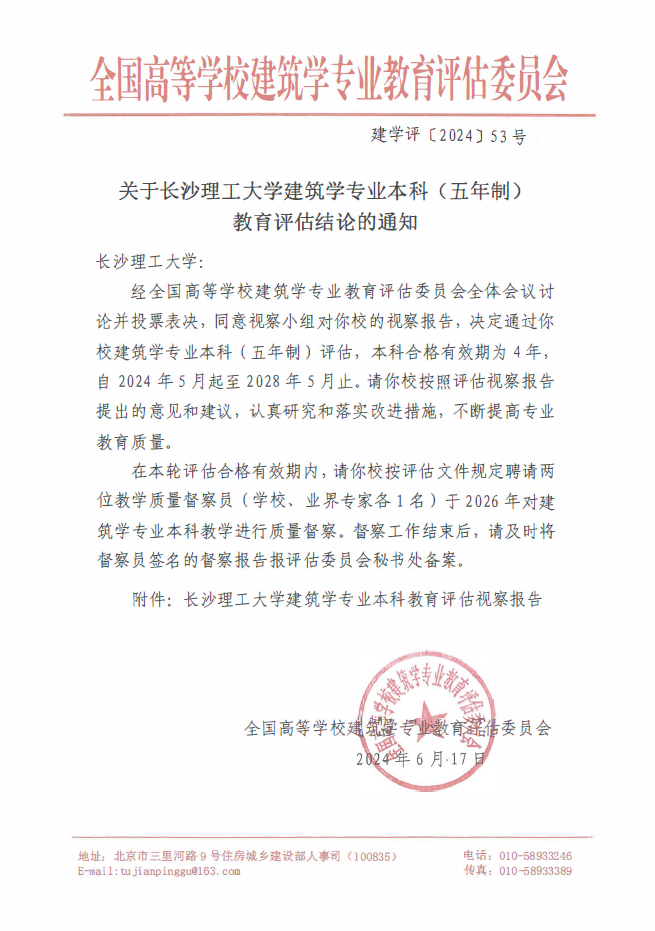 近日,全国高等学校建筑学专业教育评估委员会下发《关于开云kaiyun体育建筑学专业本科(五年制)教育评估结论的通知》(建学评[2024]53号),开云官网建筑学专业本科(五年制)顺利通过专业评估,有效期为4年。