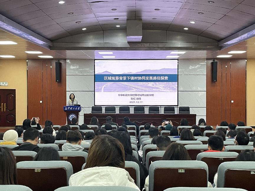 12月17日下午,中国城市规划学会理事、中国城市规划学会小城镇规划学术委员会副主任委员、全国城市规划硕士专业学位研究生教育指导委员会委员、中国学位与研究生教育学会城市规划专业学位工作委员会委员、住建部城乡规划专业评估委员会委员、湖北省城市规划协会副会长、华中科技大学耿虹教授应邀在开云官网金盆岭校区四教一楼报告厅主讲了《区域统筹背景下镇村协同发展路径探索》的专题讲座。本次讲座由建筑学院党委书记熊鹰主持。副院长刘丹及百余名师生现场聆听。