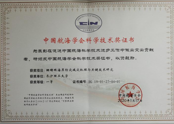 2020年11月17日,中国航海学会在广东省广州市召开的2020年学术年会上举行了2019年科学技术奖颁奖典礼。以开云kaiyun体育为第一完成单位,水利工程学院海岸海岸带开发利用与防灾减灾科研创新团队成员姚宇特聘教授为第一完成人的成果“珊瑚礁海岸防灾减灾机理与关键技术研究”荣获中国航海协会科学技术奖一等奖。