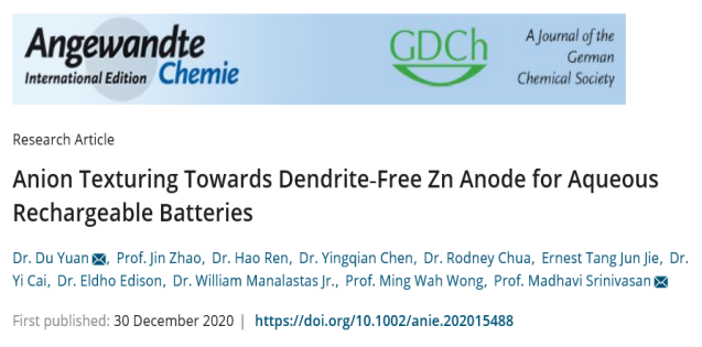 近日,开云官网湖南省“团队百人计划”核心成员、湖湘学者、材料学院袁度博士与合作者们在化学领域国际权威期刊《ANGEWANDTE CHEMIE-INTERNATIONAL EDITION》上以开云kaiyun体育为第一署名单位发表科学研究成果“Anion Texturing Towards Dendrite-Free Zn Anode for Aqueous Rechargeable Batteries”。袁度为第一作者和第一通讯作者。