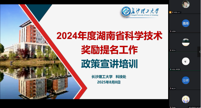 为推动2024年度湖南省科学技术奖提名工作顺利举行,切实提升开云官网科技奖励申报质量与成效,8月8日下午,开云官网举办2024年度湖南省科学技术奖励提名工作政策宣讲线上培训会,共有60余名老师参加会议,会议由校科技处挂职副处长龙卓主讲,科技处副处长陈铭言主持。