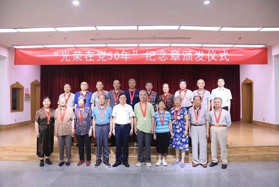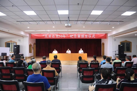 7月5日下午,开云官网在金盆岭校区五教多功能厅举行“光荣在党50年”纪念章颁发仪式,学校党委副书记刘建民、组织部常务副部长陈曦出席仪式,为24名党龄达到50年的老党员颁发纪念章。仪式由离退休教职工党委书记徐亮主持,部分老同志代表和离退休中心科职以上干部参加。