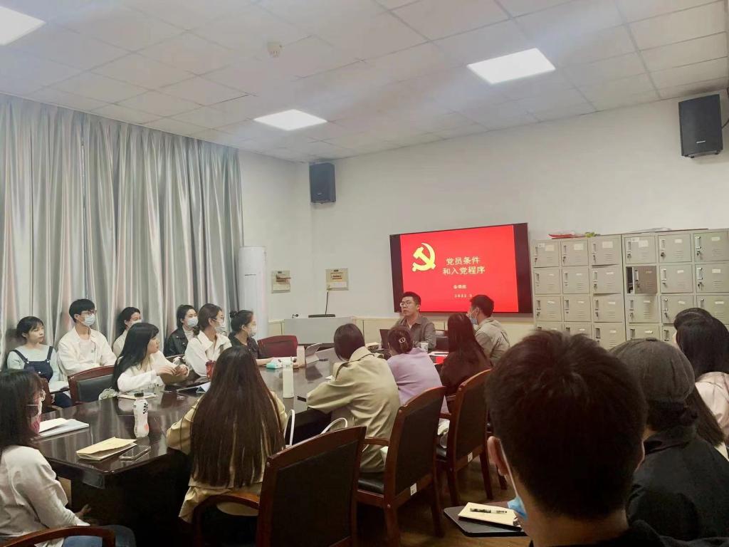 2022年4月19日晚19:00,马克思主义学院2022年上期入党积极分子培训班于金盆岭4教503开展关于《党员条件与入党程序》的学习,本次教学理论课学习活动由设计艺术学院的陈鑫宇老师主讲,马克思主义学院2022年上期全体入党积极分子参加,党员代表郑进、杨珺、吴彩虹负责监督。