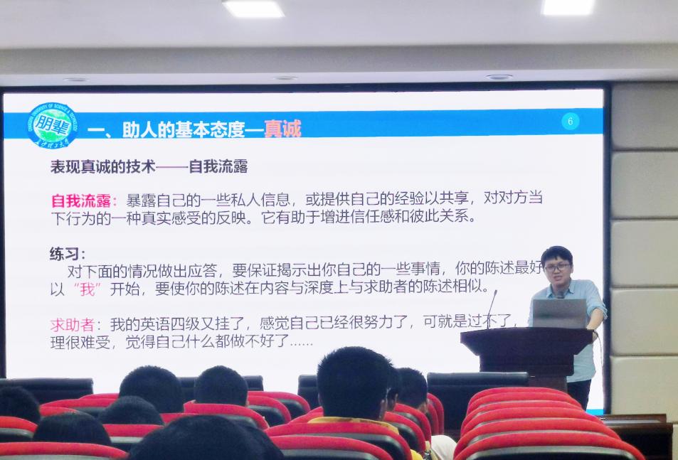 为提高朋辈互助技巧、营造“助人助己”氛围,2023年4月12日晚18:30,马克思主义学院2023年朋辈互助员培训第二次课程在工科楼A320开展。本次课程由心理中心贺子京老师主讲,马克思主义学院2022级研究生班班长、副班长、团支书、各寝室长等积极参与,马克思主义学院研究生会心理部干事组织签到。