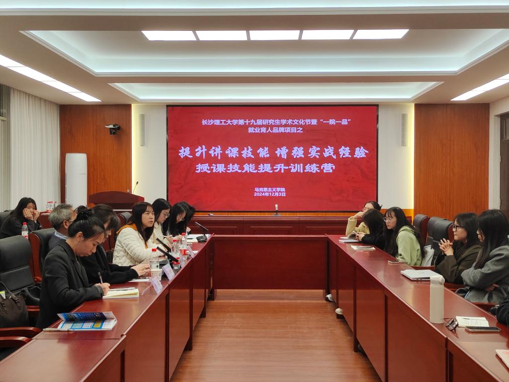 为提升马克思主义学院学生的教学水平和综合素质,助力学生实现更高质量、更充分的就业,马克思主义学院于12月3日下午4:00在文科楼B501室举办第十九届研究生学术文化节暨“一院一品”就业育人品牌项目“授课技能提升训练营之授课经验交流会。本次会议由石莞莹主持,出席的嘉宾有马克思主义学院副院长郭华、副教授赖某深、副教授高小玫、学工办主任曾蓓,以及报名参加训练营的2023级研究生共计40余人。
