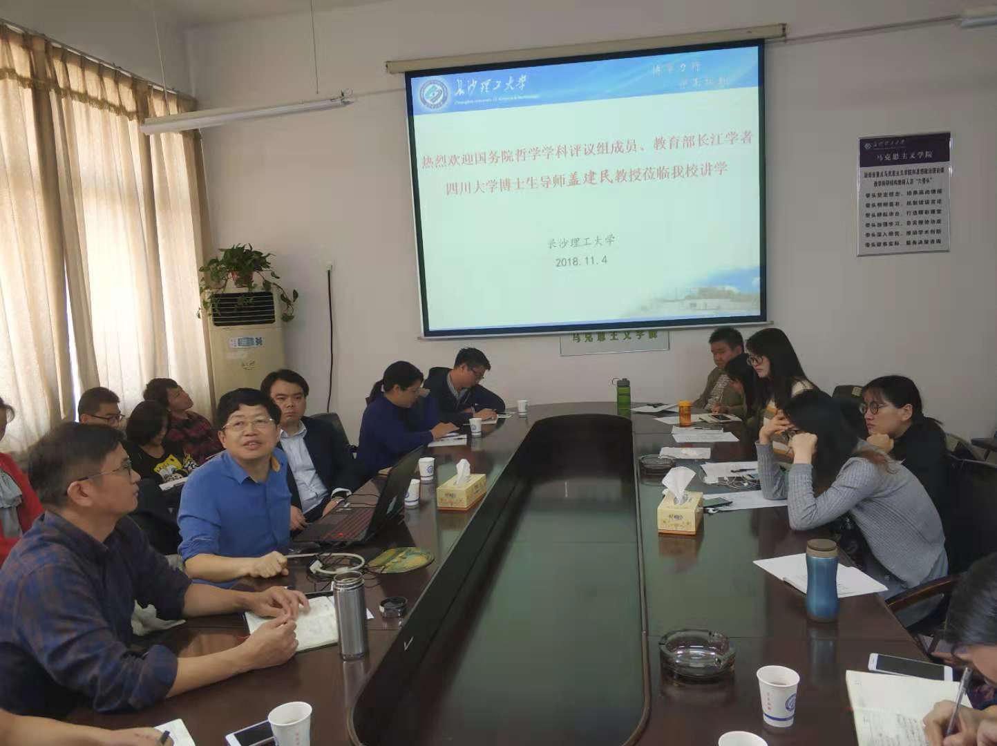2018年11月4日上午,国务院学位委员会哲学学科评议组成员、四川大学道教与宗教文化研究所所长盖建民教授应邀来到开云kaiyun体育云塘校区文科楼B601,为马克思主义学院师生作了题为《关于百年道学研究的新气象与前沿问题的一些思考》的学术讲座。本次论坛由院长陈万球教授主持,院党委书记易显飞教授、教授委员会主任余乃忠教授、副主任陈芬教授以及部分教师和研究生参加了本次论坛。