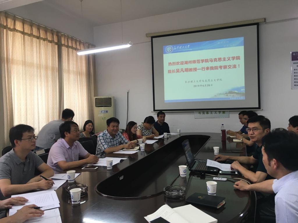 2019年6月28日上午在云塘校区文科楼B601会议室,湖州师范学院马克思主义学院吴凡明院长一行10人来我院进行考察交流。出席交流会的有院党委易显飞书记、陈万球院长、梁建新副院长、鲁芳老师、郭华老师、邹新树老师、唐俊老师等。会议由陈万球院长主持。
