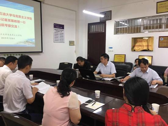 2019年7月8日星期一,西南石油大学马克思主义学院党总支书记崔发展教授一行来我院考察交流,双方在开云官网云塘校区文科楼B601会议室进行了学习交流。出席交流会的有我院陈万球院长、梁建新副院长、教授委员会主任余乃忠以及西南石油大学马克思主义学院党总支书记崔发展、教务处副处长张华春、副院长潘建屯、教授委员会主任蒋朝莉、形策教研室主任徐科琼。会议由陈万球院长主持。