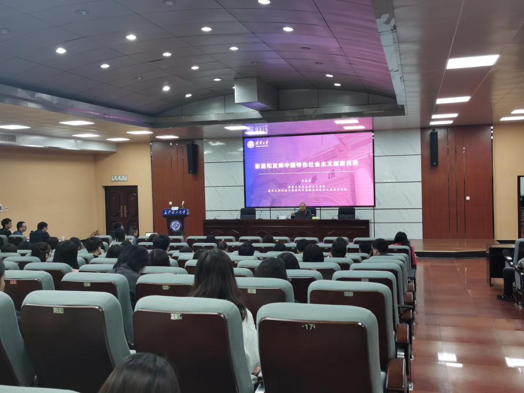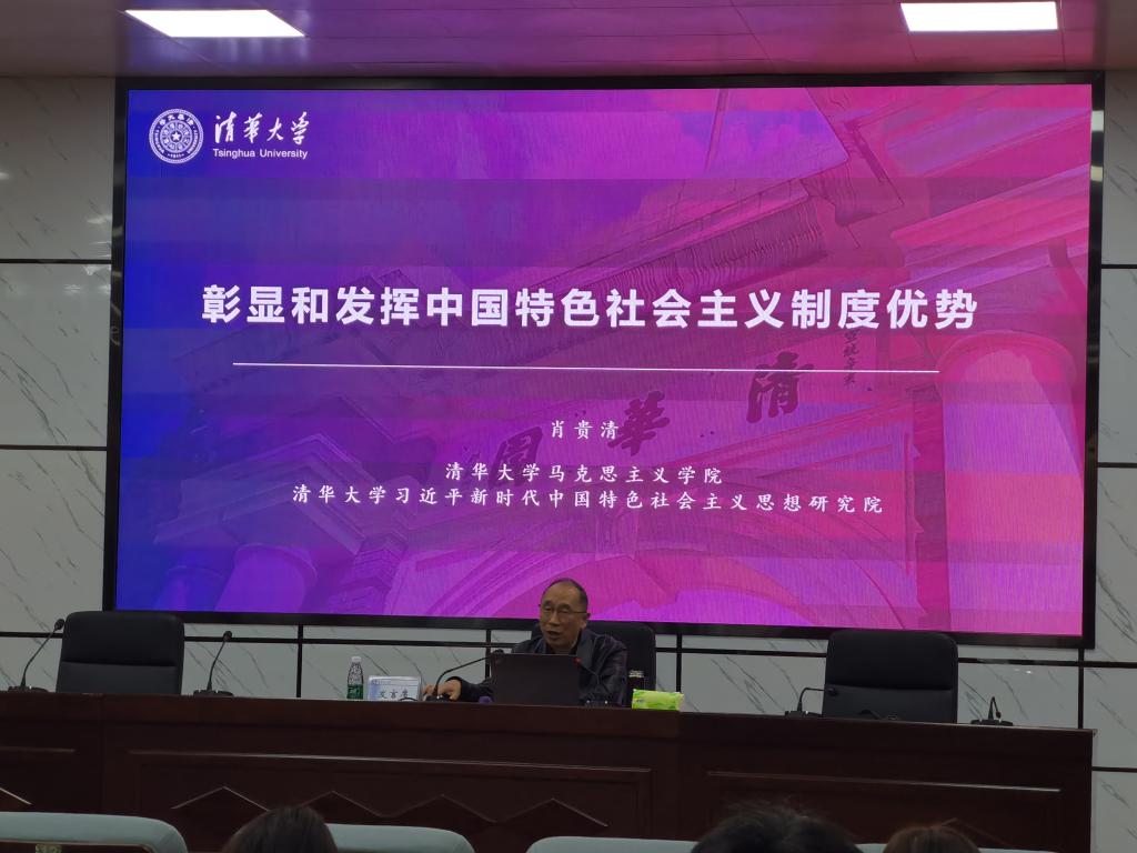 10月19日上午9时,清华大学习近平新时代中国特色社会主义思想研究院副院长、博士生导师肖贵清教授应邀在开云官网金盆岭校区4教1楼报告厅主讲了题名为《彰显和发挥中国特色社会主义制度优势》的专题讲座。马克思主义学院张明海副院长,谢文成副教授、陈方芳博士、王威峰博士等专业老师,以及部分辅导员老师、校机关部分人员,学院在校二三年级研究生及2020级马克思主义理论专业全体研究生参加了本次讲座,讲座由张明海教授主持。