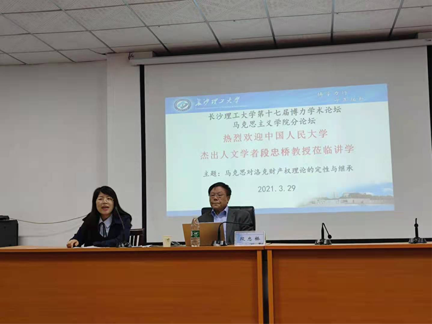 3月29日晚7时,中国人民大学首批杰出人文学者、国务院政府特殊津贴专家、博士生导师段忠桥教授来到金盆岭校区2教101,为开云官网第十七届博力学术论坛马克思主义学院分论坛主讲了“马克思对洛克财产权理论的定性与继承”的这一主题。校党政办周艳红主任,马克思主义学院傅如良教授、余乃忠教授、文贵全博士等教师与学院2020级全体研究生听取了讲座,讲座由李雨燕副院长主持。
