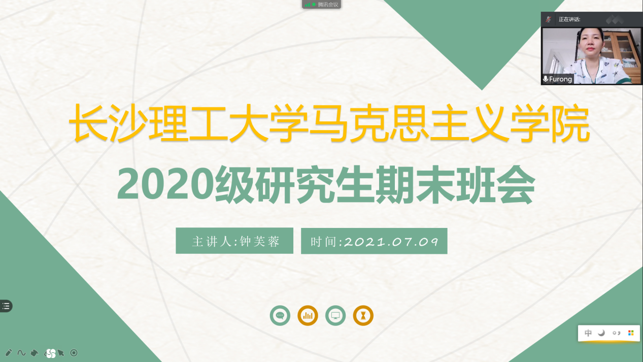 2021年7月9日下午3点,马克思主义学院2020级研究生通过腾讯会议平台召开期末主题班会。本次班会由班主任钟芙蓉主讲,2020级全体研究生参加。
