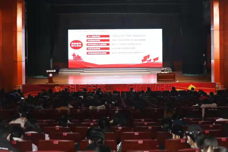 12月21日下午,校党委委员、副校长蒋璟萍在云塘校区大会堂为法学院、外国语学院、马克思主义学院三个学院师生一千余人宣讲党的十九届六中全会和湖南省第十二次党代会精神。外国语学院党委书记文丽丽主持会议。